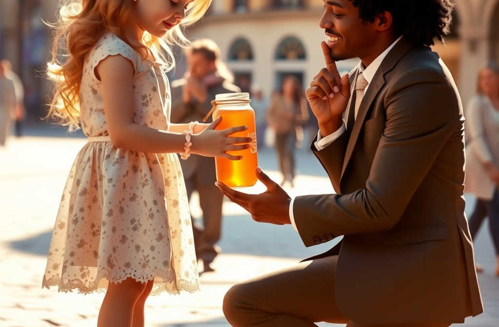 Do outro lado da praça estava uma rapariga da sua idade. A pele morena brilhava de suor, as roupas rasgadas e sujas, os pés descalços empoeirados do passeio. Nas mãos, segurava um pequeno frasco de vidro com um líquido dourado e espesso. Apesar da pobreza, os olhos dela transbordavam determinação, como se guardasse um tesouro.