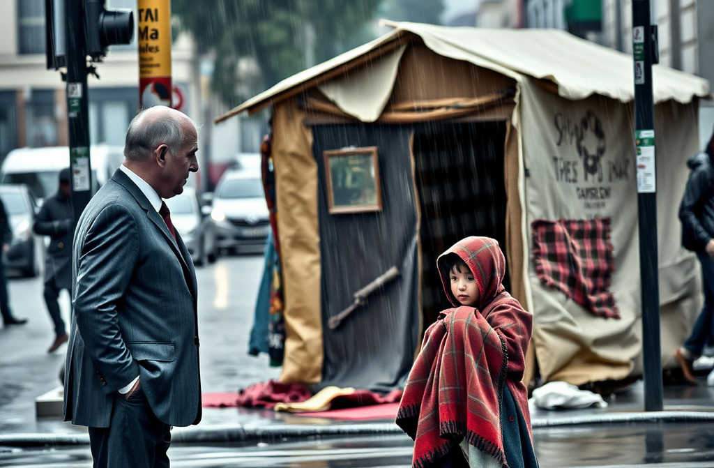 Fernando estacionou, ligou os quatro piscas e saiu. O ar cheirava a humidade, decadência e desesperança. Beatriz correu à frente, os seus sapatos gastos a chapinhar nas poças até parar diante de uma estrutura que mal podia ser chamada de abrigo. Era uma cabana feita de cartão, chapas de zinco enferrujadas e plástico preto amarrado com corda.