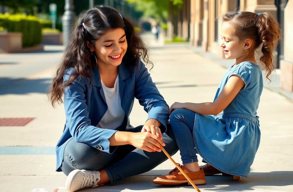 Beatriz tinha um caderno no colo, a ouvir atentamente enquanto a rapariga usava um pequeno pau para desenhar números e formas no pavimento. Ela explicava com entusiasmo, apontando para os desenhos como se estivesse a resolver um puzzle.