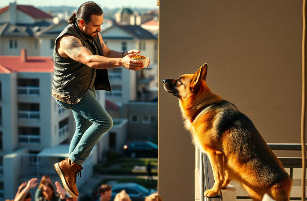 O homem segurava a tigela com uma mão e agarrava-se à varanda com a outra. Três andares no ar. Zero proteção. A alimentar um cão abandonado.