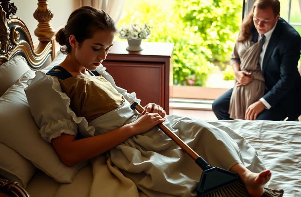 “Señor, por favor, perdóneme”, suplicó, arrodillándose junto a la cama. Sus manos aferraban la fregona como si fuera su salvación. “No fue mi intención… Lo juro. No he dormido en toda la noche. Me… debí de desmayar. No me despida, por favor, señor.”