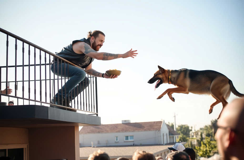 No podía llegar al perro. Pero podía darle de comer. Echó el pienso en el cuenco y lo acercó. El perro estiró el cuello entre los barrotes y comió. Desesperado. Frenético. El motero sujetaba el cuenco con una mano mientras se agarraba al borde del balcón con la otra. A tres alturas. Sin protección. Alimentando a un perro abandonado por otro.