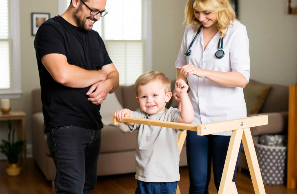 Juntos, ajustaron el andador. Sebastián puso sus manos sobre las pequeñas manos de Mateo mientras Camila le guiaba. Mateo empujó hacia abajo. Sus piernas temblaron.