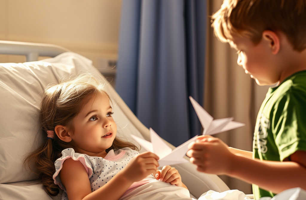 Daniel entró en la habitación de Lucía en silencio y se sentó cerca de su cama sin tocar nada. Durante varios minutos, no dijo palabra, dejando que el silencio se instalara naturalmente. Luego tomó uno de los papeles de colores y comenzó a doblar.