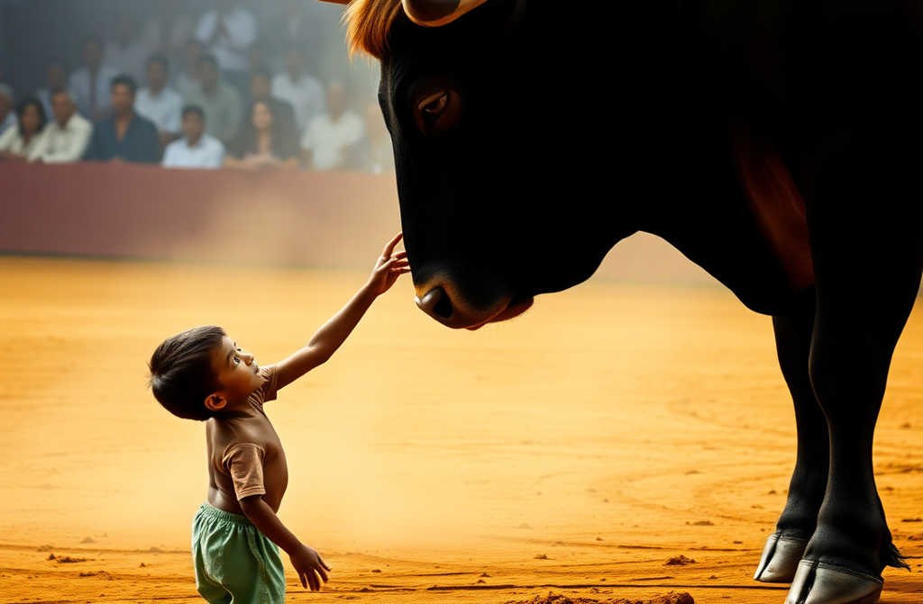 El chico dio un paso más y tocó su frente. El toro exhaló con fuerza… y bajó la cabeza. En las gradas, nadie daba crédito a lo que estaba pasando.