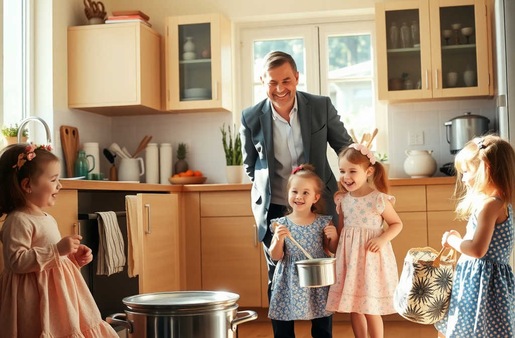 En el suelo de la cocina estaban sus hijas gemelas, de apenas dos años, mejillas sonrojadas por la emoción. Cada una sostenía una cacerola de acero inoxidable, golpeándola alegremente con cucharillas pequeñas. Sus coletas diminutas saltaban con cada movimiento. Se reían. De verdad, la risa que sale del vientre y que no había escuchado desde antes de que su madre falleciera.