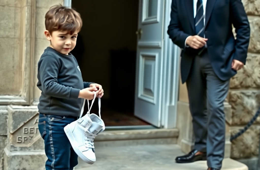 Allí estaba un niño, de no más de nueve años, descalzo sobre los fríos peldaños de piedra, con los vaqueros desgastados en las rodillas y una camiseta descolorida manchada de polvo y hierba. En sus manos, ofrecidos con cuidado como si pudieran romperse, llevaba un par de zapatillas blancas impolutas, demasiado nuevas para el resto de su aspecto, con los cordones atados cuidadosamente.