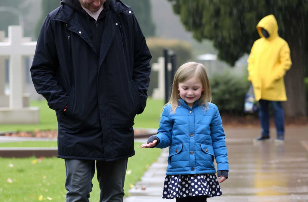 A chuva aumentava, e Eduardo sentia o peito apertar-se de novo. Mal percebeu quando uma figura pequena surgiu entre os túmulos — uma menina magra, de uns onze anos, com um casaco amarelo desbotado. Os sapatos encharcados faziam um som molhado na grama ao parar ao seu lado.