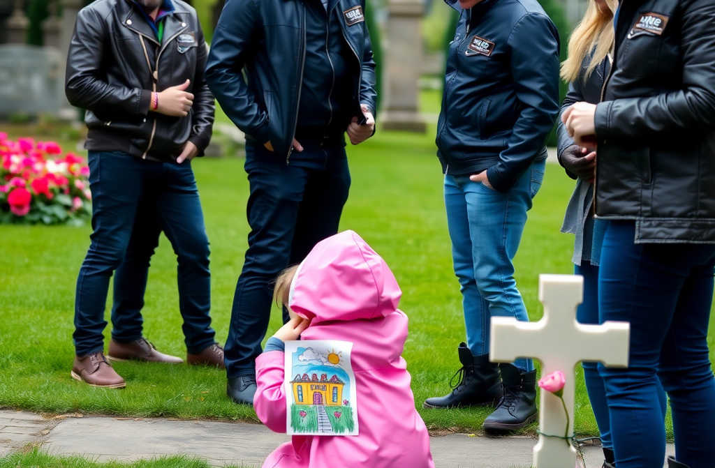 Vestia um casaco cor-de-rosa um pouco pequeno, com as mangas curtas a deixar os pulsos à vista, e agarrava uma mochila com um desenho de um unicórnio. As cores vivas do seu equipamento chocavam com a terra escura e húmida da sepultura fresca.