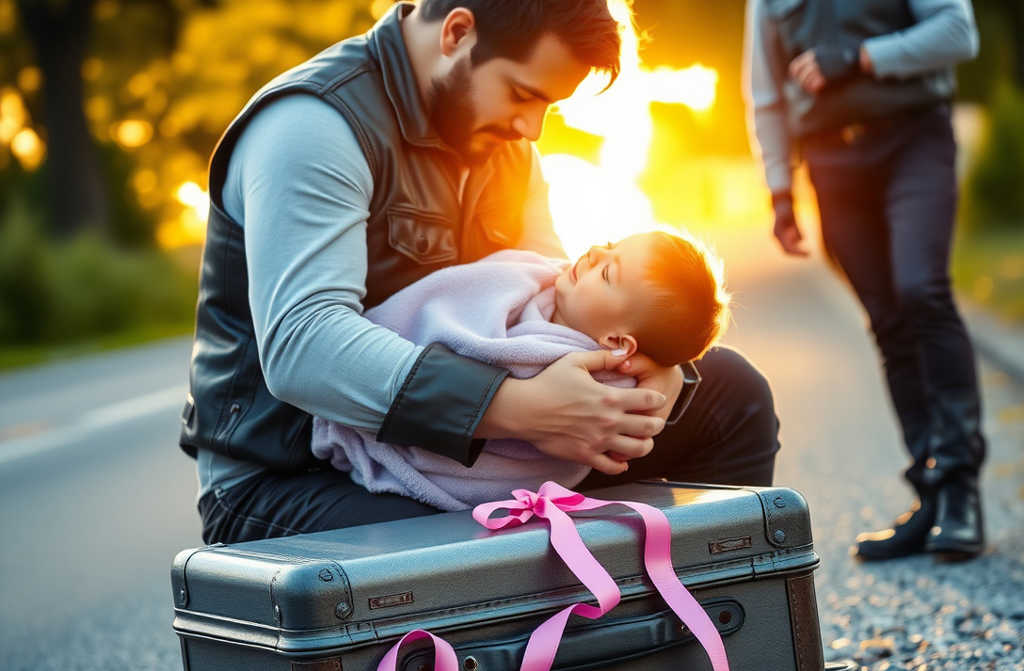 Los demás formaron un semicírculo de cuero y mezclilla. Nadie habló. Nadie maldijo. Solo mirábamos lo imposible: una niña, empaquetada como equipaje, abandonada en la carretera donde cualquier cosa—un lobo, el calor, un conductor distraído—podría haber terminado con ella.