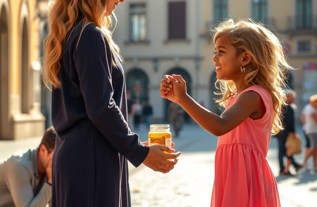 Al otro lado de la plaza había una niña de su edad. Su piel morena brillaba bajo el sol, sus ropas estaban rotas y sus pies descalzos cubiertos de polvo. En sus manos sostenía un pequeño frasco de cristal con un líquido dorado y espeso. A pesar de su pobreza, sus ojos reflejaban una determinación inquebrantable, como si guardara un tesoro.