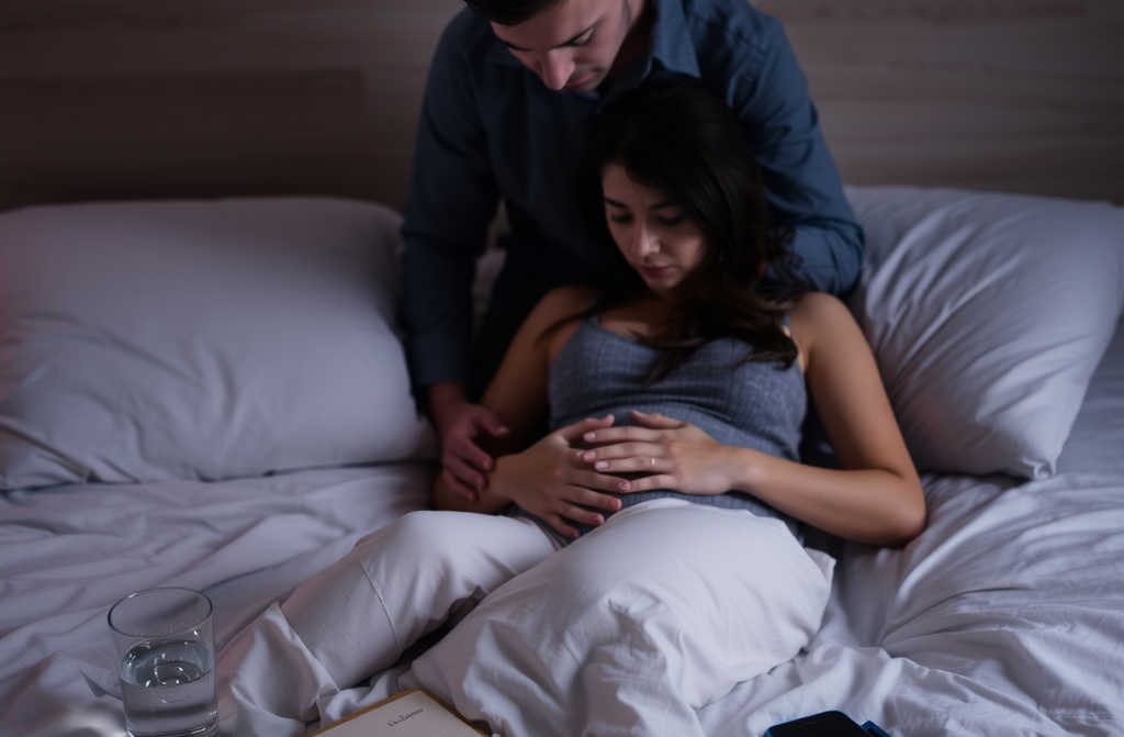 Lucía se sentó rígida, con las dos manos en el vientre, respirando con cada oleada de dolor.