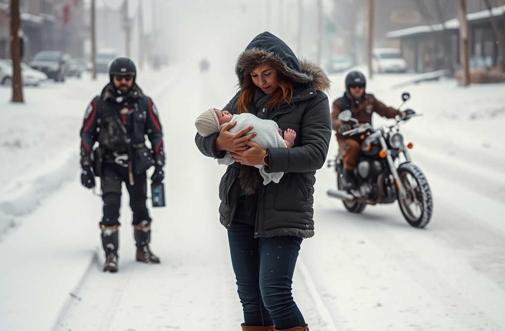 A neve caía em silêncio à sua volta. Nenhum dos motociclistas falou. Tiago segurou o recém-nascido junto ao peito, embrulhando-o no seu casaco de couro enquanto os outros inclinavam a cabeça em silêncio.