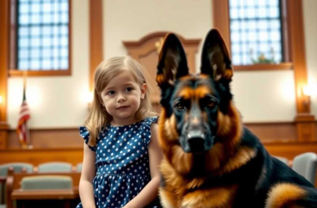 Detrás de ella, se oyó el sonido suave de uñas en el linóleo: Sombra. El juzgado contuvo la respiración cuando el gran pastor alemán entró en la sala. Calmo y majestuoso, sus ojos marrones escanearon el espacio—alerta pero sereno—con su chaleco terapéutico oficial bien ajustado al pecho. Sombra había sido entrenado para consolar a víctimas infantiles durante testimonios, pero nadie sabía lo crucial que sería su papel hoy.
