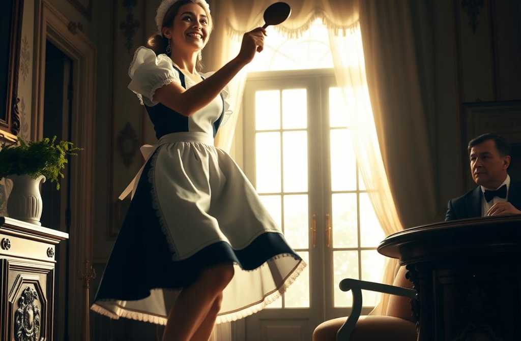 O lustre imponente brilhava sob os raios do sol da manhã, lançando reflexos dourados sobre o chão de mármore. Beatriz rodopiava descalça, o avental branco esvoaçando ao ritmo dos seus passos. Na mão, segurava uma colher de pau como se fosse um microfone, cantando para uma plateia imaginária. O silêncio da mansão dava-lhe uma liberdade rara — sonhar, fingir, esquecer que era apenas uma simples criada num mundo que não era o seu.