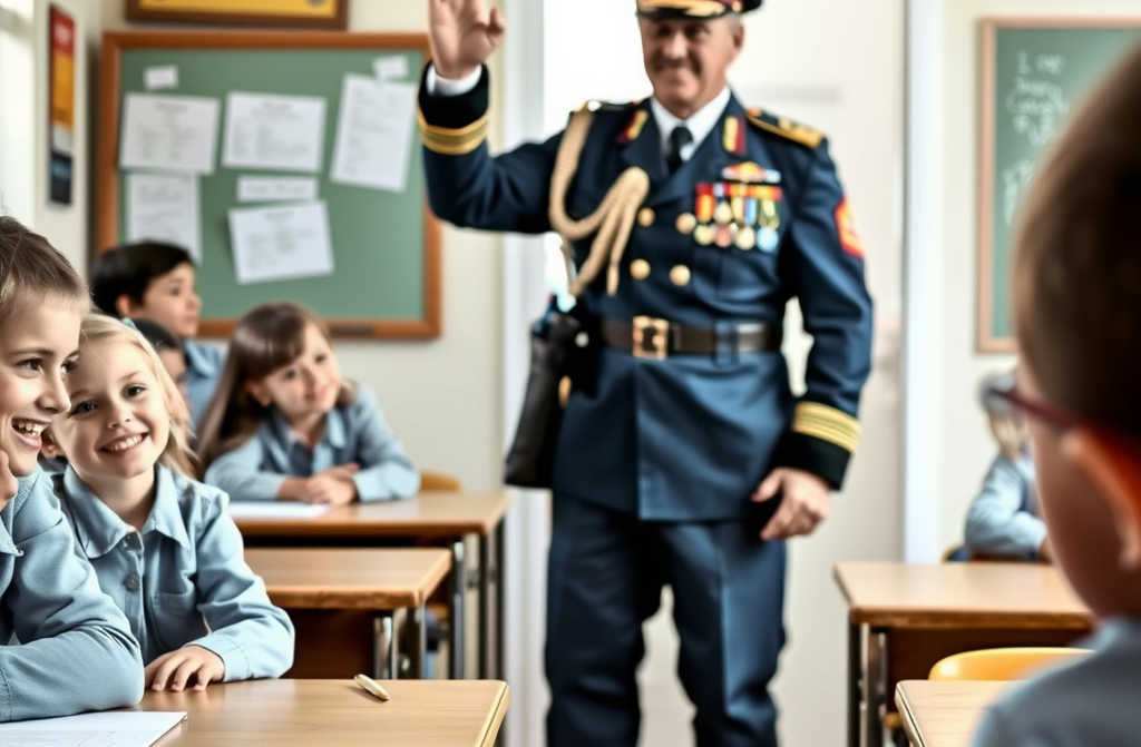 Os alunos formaram fila depois do recreio, ainda a conversar. De repente, o corredor ficou em silêncio. O som de passos firmes ecoou em direção à sala. Todas as cabeças viraram-se quando um homem alto, de uniforme militar e condecorações brilhantes, entrou. A postura dele transmitia autoridade.