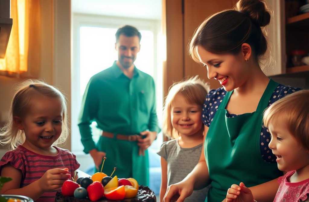 Ali estava Mariana, vestida com o seu uniforme verde-esmeralda, o cabelo preso sob o lenço de empregada. À mesa, Tiago e Beatriz sentavam-se com os rostos iluminados pela alegria. Sobre a toalha, um bolo de chocolate acabado de sair do forno, decorado com frutas e chantilly. Mariana cortava fatias generosas, servindo-as nos pratos enquanto as crianças batiam palmas entusiasmadas. A camisa azul de Tiago estava salpicada de cacau, e o vestido cor-de-rosa de Beatriz tinha uma nata de creme — sinais de que haviam ajudado Mariana na cozinha.