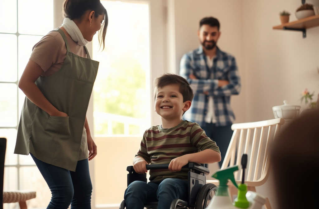 Era a cena ao lado dela. O seu filho, Tiago, de apenas quatro anos, estava de pé com as suas pequenas muletas roxas, segurando um pano de cozinha e tentando ajudar a jovem a limpar o chão.