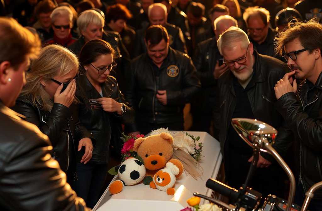 Um a um, os motoqueiros passaram pelo caixão. Homens rudes, com lágrimas nos olhos, deixaram pequenas oferendas: um peluche, uma mota de brinquedo, flores, até uma jaqueta de couro infantil bordada com “Cavaleiro Honorário”.