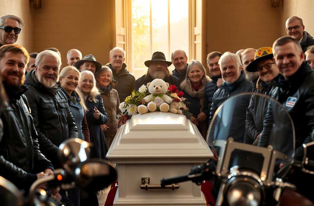 Um a um, os motards passaram diante do caixão. Homens durões, com lágrimas nos olhos, deixaram pequenas oferendas: um peluche, uma mota de brincar, flores, até um casaco de cabedal infantil com o bordado “Cavaleiro Honorário”.
