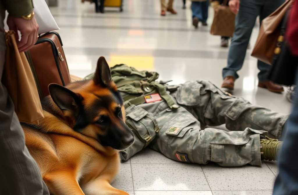 En el aeropuerto de Barajas, la gente se detuvo al ver a un soldado tendido en el frío suelo mientras un pastor alemán ladraba a los transeúntes. Al principio, todos quedaron horrorizados hasta que comprendieron la razón del extraño comportamiento del perro.