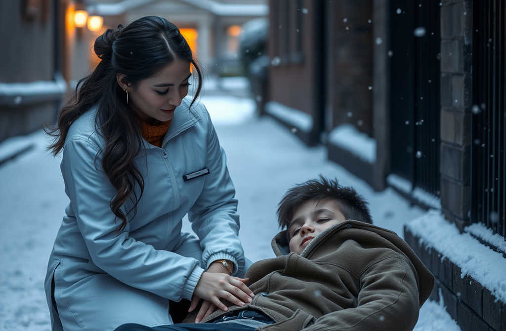 Arrodillándose, Lucía giró suavemente al chico, conteniendo un grito al ver su tez mortalmente pálida. No podría tener más de catorce años, vestido con ropa que valía más que todo su guardarropa, un uniforme de colegio privado bajo un abrigo de cachemira que parecía tremendamente fuera de lugar en ese barrio. “Oye, ¿puedes oírme?”, susurró, revisando si había heridas mientras su formación de enfermería tomaba el control. Su pulso era débil pero estable. No había heridas visibles, pero su piel estaba fría y húmeda al tacto. Síntomas que reconocía demasiado bien. Mientras Lucía rebuscaba en sus bolsillos, buscando identificación o medicación, sus dedos encontraron un smartphone elegante con una funda que probablemente costaba más que su sueldo semanal.