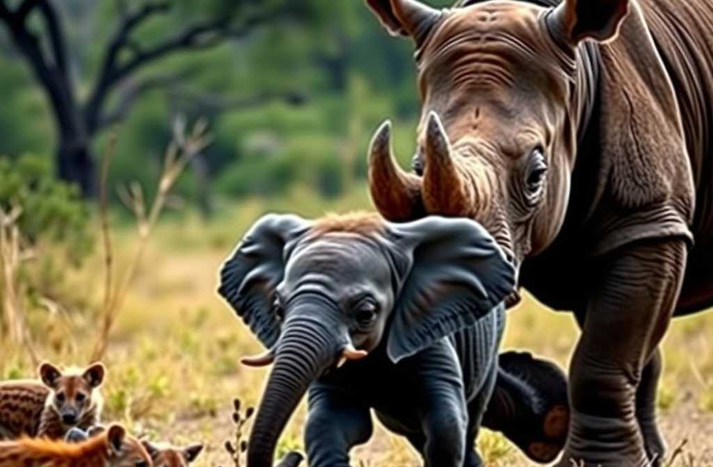 El elefantito temblaba, pero el rinoceronte inclinó suavemente la cabeza, como asegurándose de que estuviera bien. Un instante después llegó su madre, envolviendo a su crío con la trompa y barritando de alivio.